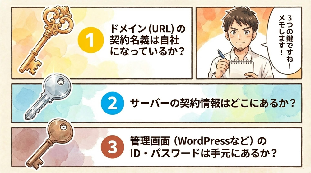 このホームページの「鍵」にあたるものが「サーバーログイン情報」「ドメイン所有権」「サイトログイン情報」です。