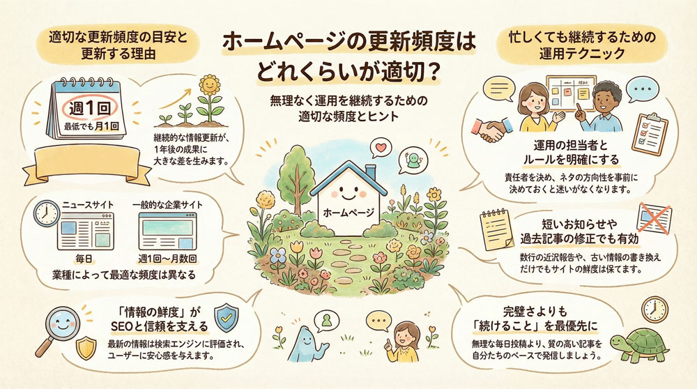 まず押さえておきたいのは、ホームページに最適な更新頻度は一律ではないという点です。